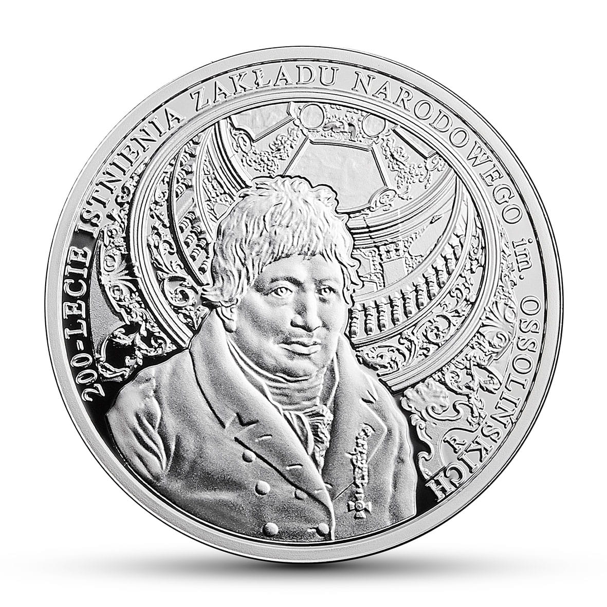 W czerwcu 1817 r. cesarz Austrii Franciszek I zatwierdził przedłożony przez Józefa Maksymiliana Ossolińskiego akt Ustanowienia familijnego Biblioteki Publicznej pod imieniem Ossolińskich we Lwowie, tym samym do istnienia powołana została instytucja, która odegrała znaczącą rolę w dziejach polskiej kultury. W zamyśle Ossolińskiego miała być skarbnicą narodowych pamiątek. Dzieło Ossolińskiego rychło wsparł swymi bogatymi zbiorami Henryk Lubomirski. Jego kolekcje, na mocy umowy zawartej w grudniu 1823 r., utworzyły Muzeum Lubomirskich, wchodzące w skład Ustanowienia. Mimo oporu władz austriackich instytut Ossolińskiego stał się Zakładem Narodowym, czyli Ossolineum. Upadek powstania listopadowego wyraźnie ukazał, jak ważna jest jego rola – po zamknięciu uniwersytetów w Wilnie i Warszawie, Ossolineum zostało drugą po Uniwersytecie Jagiellońskim najważniejszą polską placówką kultury. Działalność Zakładu wspierali od początku istnienia liczni darczyńcy, którzy w poczuciu patriotycznego obowiązku nieprzerwanie zasilali jego zbiory. W dwudziestoleciu międzywojennym Zakład powiększył się o wydawnictwo (znane przede wszystkim z serii „Biblioteka Narodowa” ). Po klęsce 1939 r. zbiory Zakładu, zwłaszcza muzealia, zostały rozparcelowane, bibliotekę zaś przekształcono w sowiecką, a później niemiecką instytucję. W 1946 r. część księgozbioru ossolińskiego została przetransportowana do Wrocławia, gdzie postanowiono odtworzyć Zakład Narodowy. W 1953 r. stał się on częścią Polskiej Akademii Nauk. Po 1989 r. Zakład powrócił do swej przedwojennej struktury. Dzisiaj, tak jak przed laty we Lwowie, składa się z Biblioteki, Muzeum Książąt Lubomirskich i Wydawnictwa, a od 2016 r. także z Muzeum „Pana Tadeusza”, prezentującego publiczności m.in. rękopis tej narodowej epopei. Nie ma drugiej polskiej instytucji, która przetrwała tyle dziejowych burz i kataklizmów co Ossolineum. Przez 200 lat służyło Polakom i gromadziło dla kolejnych pokoleń bezcenne pamiątki polskiej kultury. Na awersie monety złotej znajduje się wizerunek kopuły Zakładu Narodowego im. Ossolińskich we Wrocławiu, częściowo przesłoniętej przez kontur frontonu północnej fasady budynku. Na rewersie widnieje popiersie Józefa Maksymiliana Ossolińskiego w profilu prawym według portretu Jana Maszkowskiego z 1818 r. i litografii Walentego Śliwickiego z 1820 r. Na awersie monety srebrnej znajduje się wizerunek kopuły Zakładu Narodowego im. Ossoliń- skich we Wrocławiu od strony północno-zachodniej, z zarysem dachu budynku w tle. Na rewersie widoczne jest popiersie Józefa Maksymiliana Ossolińskiego z twarzą skierowaną w prawo według litografii Karla Mahnkego sprzed 1836 r., na tle barokowych zdobień wnętrza kopuły. dr Łukasz Koniarek