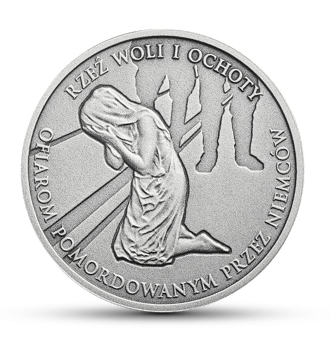 Niemiecki mord na cywilnej ludności Woli i Ochoty był jedną z największych masowych zbrodni podczas IIwojny światowej. Nawiadomość owybuchu powstania w Warszawie (1 VIII 1944 r.) Hitler wydał rozkaz zniszczenia Warszawy i zgładzenia wszystkich jej mieszkań- ców. Do dzieła ruszyli funkcjonariusze SS, policji i żołnierze Wehrmachtu, mordując schwytanych powstańców oraz ludność cywilną. Już 1 VIII Niemcy zamordowali grupy Polaków na rogu ulic Sowińskiego i Karlińskiego, przy ul. Okopowej 20 oraz Wolskiej 165. Do 4 VIII żoł- nierze dywizji pancernej „Hermann Goering” zamordowali około 400 osób, a żołnierze 608. Pułku Ochrony wypędzali ludność cywilną z domów, dokonując mordów, grabieży i gwałtów na kobietach. Od 4 VIII trwała „odsiecz”, w której od zachodu na Warszawę ruszył pułk specjalny SS pod dowództwem SS-Oberfuehrera Oskara Dirlewangera, złożony ze zwolnionych z więzień kryminalistów, grupa policyjna SS-Gruppenfuehrera Heinza Reinefahrta i wieloetniczna brygada SS RONA (Rosyjska Wyzwoleńcza Armia Ludowa) SS Brigadefuehrera Bronisława Kamińskiego. 5 VIII oddziały te rozpoczęły masakrę cywilnej ludności Woli. Mordercy zabijali przy pomocy karabinów maszynowych bez względu na płeć i wiek ofiar. Zbiorowym egzekucjom towarzyszyły rabunki i gwałty na kobietach, a nawet nieletnich dziewczynkach. Niektóre ofiary prowadzono jako „żywe tarcze” na pozycje powstańcze. W rejonie ulic Górczewskiej i Moczydła wymordowano od 5 do 10 tys. osób, w tym personel i pacjentów Szpitala Wolskiego. W fabryce „Ursus” zamordowano około 6 tys. osób, w tym troje dzieci Wandy Lurie (1911–1989), która ciężko ranna przeżyła pod zwałami ciał i była ważnym świadkiem masakry. W fabryce Franaszka zamordowano około 4 tys. osób, przy ulicy Górczewskiej 9 – około 3 tys., w zajezdni tramwajowej przy ulicy Młynarskiej, na ulicy Wolskiej oraz na terenie Parku Sowińskiego – po około tysiąc osób. W niektórych miejscach palone stosy ciał sięgały 25 metrów wysokości. 6 VIII masakrę kontynuowano w składzie maszyn rolniczych przy ulicy Wolskiej, gdzie rozstrzelano około 2 tys. osób, a także w fabryce Franaszka, w rejonie Górczewskiej, Moczydła i w okolicy klasztoru redemptorystów przy Karolkowej. Jeden z batalionów azerskich wymordował około 200 chorych w Szpitalu Karola i Marii. Około 7 tys. osób zamordowano 7 VIII, głównie w Halach Mirowskich. Jednocześnie tysiące ludności cywilnej wyrzucano z domów i pędzono wśród pożarów istosów trupów w kierunku Dworca Zachodniego i Włoch. W ciągu następnych dni rozmiary masakry zmalały, lecz do połowy sierpnia trwały wysiedlenia, mordy, rabunki i gwałty. Ogółem liczbę ofiar masakry na Woli ocenia się na około 50 tys. osób. Masakra na Ochocie rozpoczęła się 4 VIII, gdy do akcji wkroczyły oddziały RONA pod ogólnym dowództwem niemieckim. 5 VIII utworzono obóz przejściowy dla wysiedlanych na terenie targu warzywnego, tzw. Zieleniaka (obecne Hale Banacha), gdzie zgromadzono w ciągu następnych dni kilkadziesiąt tysięcy osób, stopniowo wypędzanych do obozu w Pruszkowie. W drodze na „Zieleniak” i na miejscu esesmani oraz pijani RON-owcy mordowali i gwałcili wysiedlanych. Ciała tych, którzy zostali tam zamordowani lub zmarli z wycieńczenia, układano w sterty przy murze obozu. 5 i 6 VIII oddziały RONA wymordowały ponad 150 osób w Instytucie Radowym przy ulicy Wawelskiej. Innym miejscem masowych mordów była Kolonia Staszica, gdzie RON-owcy systematycznie gwałcili, rabowali i mordowali kryjących się tam cywilów. Zwłoki ofiar palono na terenie Liceum im. Hugo Kołłątaja. Ogółem liczbę ofiar rzezi Ochoty ocenia się na około 10 tys. osób. Podobnie jak pomnik Pamięci Ludności Woli Wymordowanej w Czasie Powstania 1944 r. przy rozwidleniu Alei „Solidarności” i ulicy Leszno w Warszawie, emisja ta ma na celu upamiętnienie niewinnych ofiar tej zbrodni. Na rewersie monety przedstawiono postać klęczą- cej kobiety, symbolizującej ofiarę wydarzeń sierpnia 1944 r., oraz – zarysowane za jej plecami – fragmenty wizerunków dwóch męskich postaci, symbolizują- cych oprawców. Na awersie monety został przedstawiony fragment pomnika Pamięci Ludności Woli Wymordowanej w Czasie Powstania 1944 r., autorstwa Ryszarda Stryjeckiego. Prof. Wojciech Roszkowski
