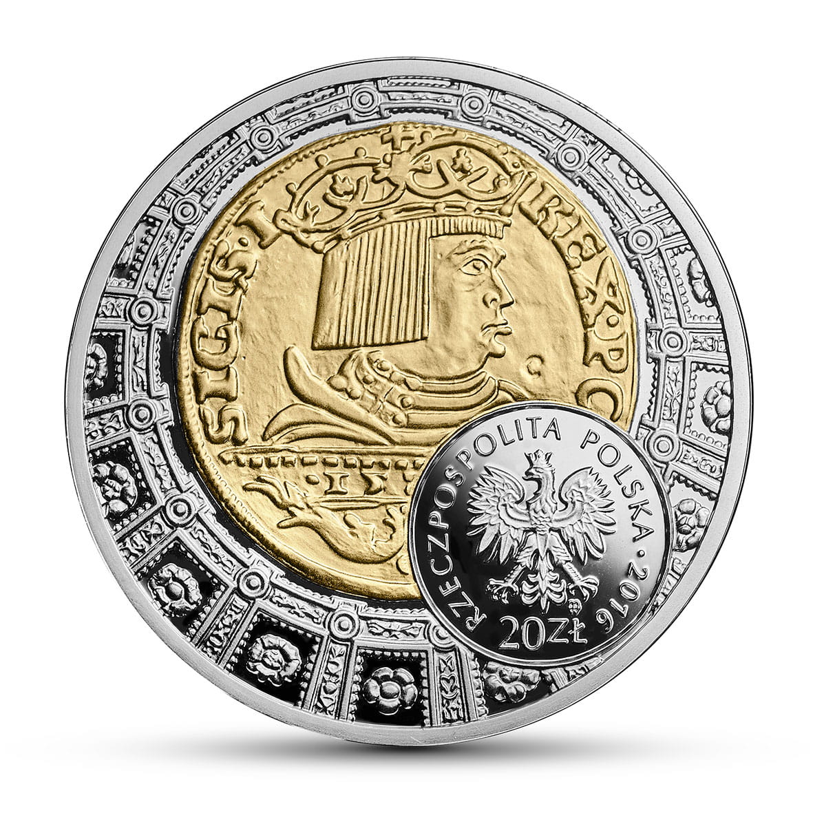 Panowanie Zygmunta Starego (1506–1548) rozpoczyna nowy okres w historii pieniądza polskiego. Po epoce monety późnośredniowiecznej, opartej na półgroszu, nastąpił czas pieniądza nowożytnego. Mamy wówczas do czynienia już z całym systemem pieniężnym. Jego podstawą był złoty obrachunkowy, na który składało się 30 realnych groszy. Istniały również krotności grosza w postaci trojaków i szóstaków a także nominały drobniejsze – półgroszki, denary i trzeciaki. Zmienił się też wygląd monet. W napisach litery gotyckie zostały zastąpione przez litery zwane łacińskimi. Pojawiły się prawdziwie renesansowe, realistyczne portrety króla, a w legendach zaczęto umieszczać daty emisji. Przełomowe znaczenie miało wprowadzenie w 1528 roku waluty złotej – złotego polskiego zwanego dukatem. Do naszej serii został wybrany dukat z 1529 roku. Na jego awersie widać zwró- cone w prawo popiersie króla w zbroi i koronie na głowie. Uwagę zwraca założony pod koronę kró- lewską czepiec, który przypomina fryzurę. W otoku czytamy: SIGIS[mundus] ◆ I – REX ◆ POL[onie] ◆, czyli Zygmunt I król Polski. U dołu, poziomo, data 1529 i ornament roślinny. Na rewersie umieszczono pod koroną pięciopolową tarczę herbową. U góry nosi ona Orła polskiego i Pogoń litewską, na dole Lwa ruskiego i Orła pruskiego, w środku natomiast herb Habsburgów. Ten ostatni upamiętniał matkę króla – Elżbietę Rakuszankę. Po bokach tarczy widzimy litery C – N, które oznaczają miejsce wybicia (Cracovia) i imię podskarbiego koronnego Mikołaja Szydłowieckiego (Nicolaus). W otoku sentencja: IVSTVS VT PALMA FLOREBIT (Sprawiedliwy jako palma zakwitnie). Na nowej monecie główny motyw stanowi oczywiście odwzorowanie dukata. Na awersie elementem dodatkowym jest okrągła metryka z Orłem, nominałem 20 złotych i datą 2016. Całość została ujęta w bardzo efektowne obramowanie nawiązujące do wnętrza kopuły Kaplicy Zygmuntowskiej. Na stronie odwrotnej rewersowi dukata towarzyszy (w postaci poddruku laserowego) Orzeł pod koroną z XVI-wiecznego drzeworytu. Stanisław Suchodolski